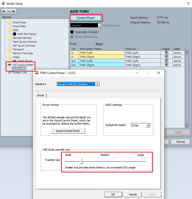 5. 왼쪽의 리스트에서 VST Audio System을 선택 한 후, ASIO Driver를 ASIO THRII로 선택